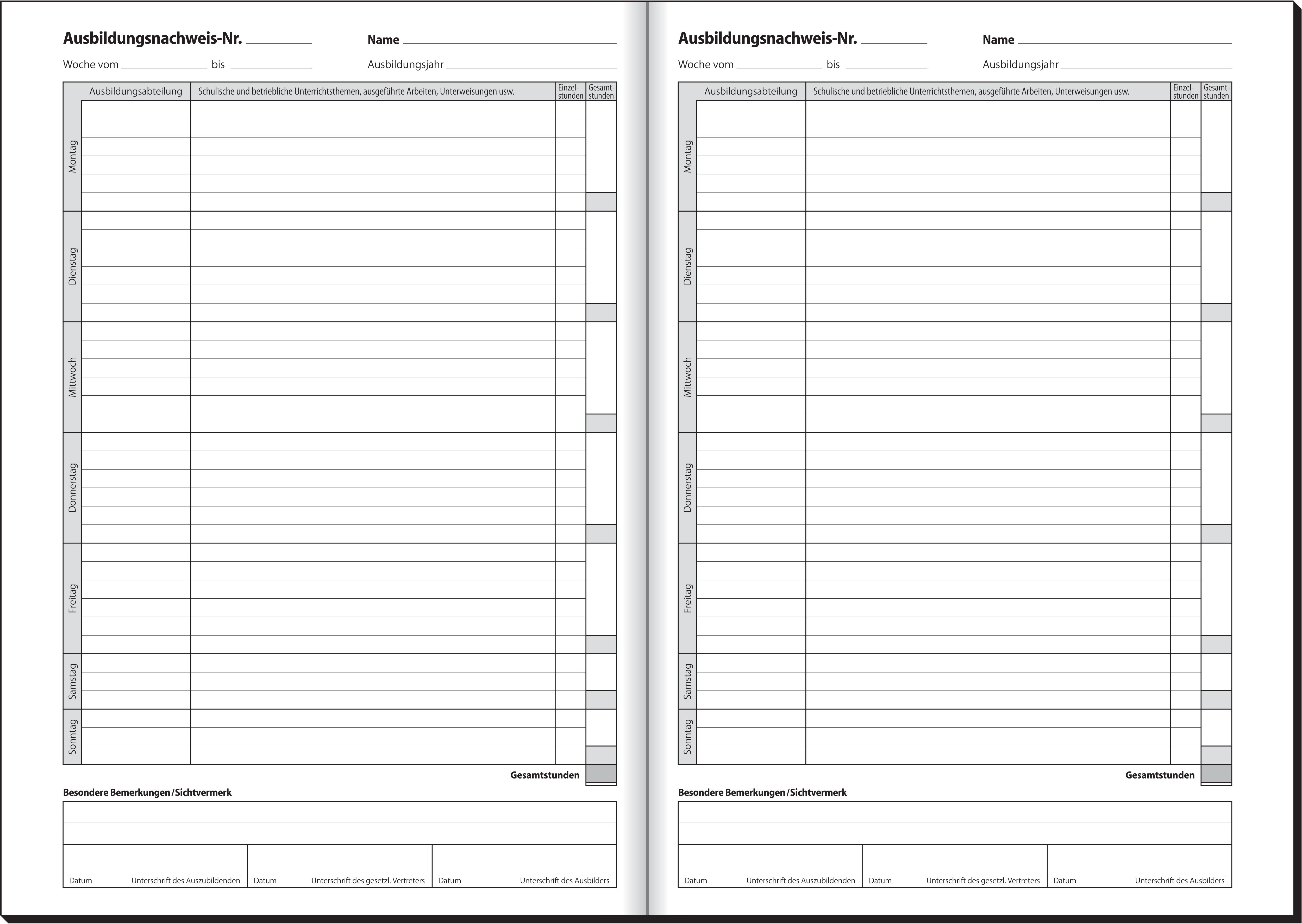 Ausbildungsnachweis (Berichtsheft) für tägliche Eintragungen im Format DIN A4 mit 28 Blatt. Aufteilung in Ausbildungstage (Montag bis Sonntag) und Stunden, immer 1 Woche im Überblick auf 1 Seite, ausreichend für 1 Jahr. V.a. für kaufmännische Berufe geeignet.