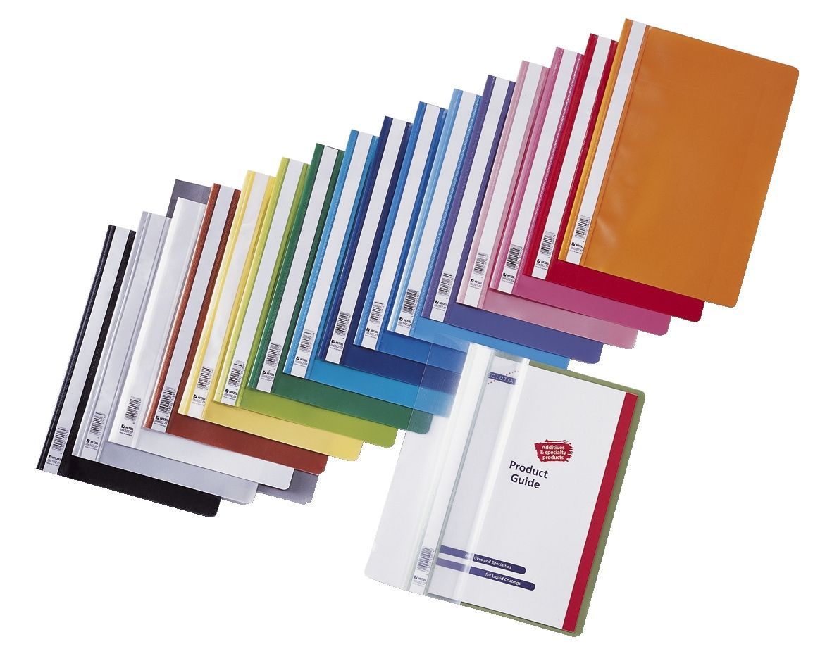 Schnellhefter aus umweltfreundlichem Polypropylen in A4 hoch, Vorderseite glasklar, Rückseite farbig, mit 2-seitig beschriftbarem Randstreifen, Fassungsvermögen ca. 250 Blatt (80 g/qm).