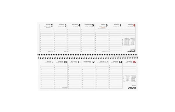 1 Woche/1 Seite, Sonn- und Feiertage hervorgehoben, Zweimonatsübersicht. 60 Seiten. Tages-, Wochen- und Zinstagezählung. Stundeneinteilung von 8 - 20 Uhr. Druck: schwarz/rot. PEFC-Zertifizierung. Blattgröße: 300 x 100 mm (B x H). Spiralbindung. Kalendarium 1-sprachig deutsch. Einband aus Karton in blau.