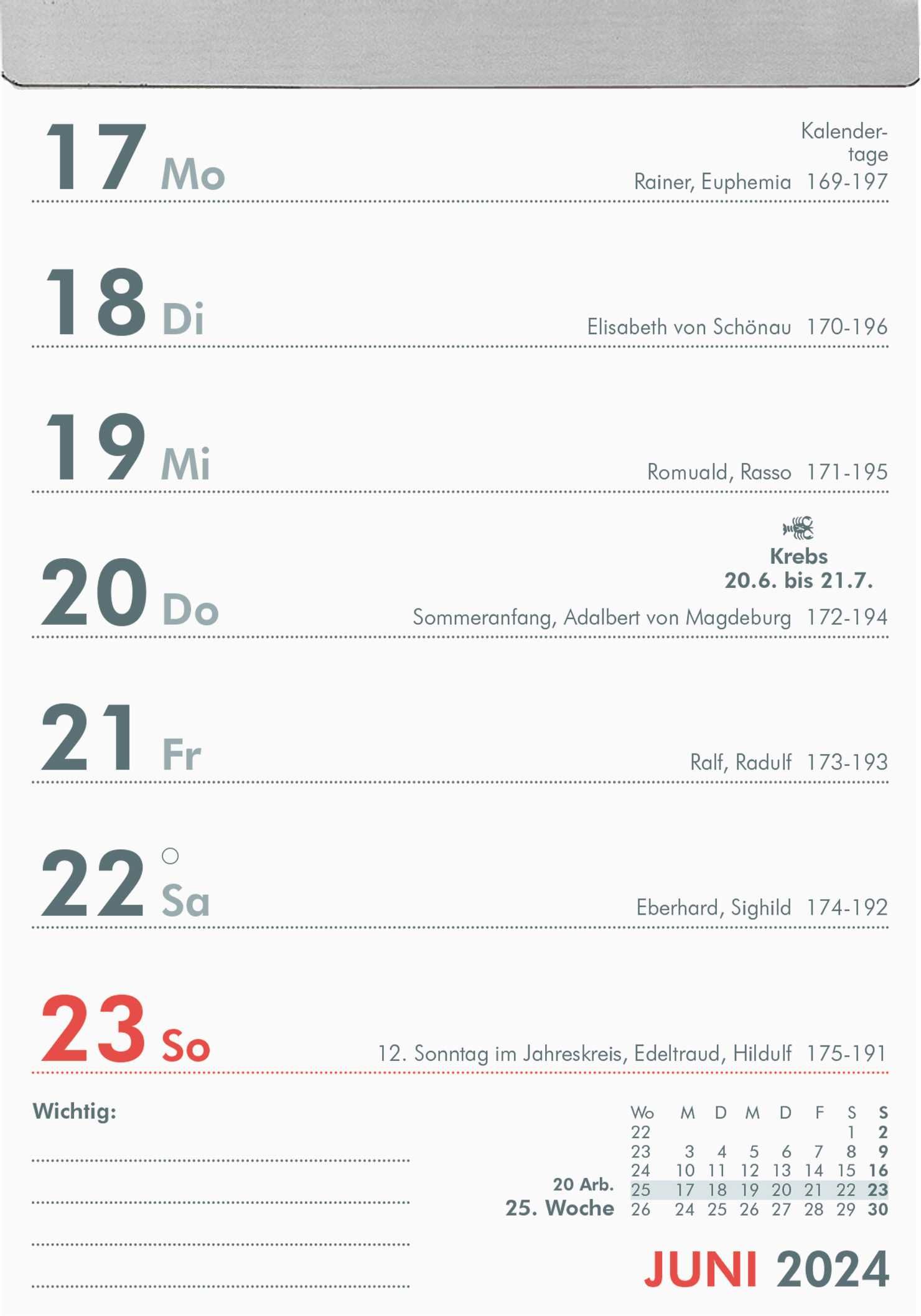 1 Woche/1 Blatt, Sonn- und Feiertage hervorgehoben, Tages- und Wochenzählung, Monatsübersicht, Mondphasen, Namenstage, Sternzeichen, Steuertermine, Druckfarbe: grau/rot. Wissenswertes auf der Rückseite. Auf der Rückseite Haushalts- und Gartentipps, Rezepte, Gedenktage, Witze, Rätzel u.v.m., hellgraue Patentklammer, für Rückwand 350/351. Größe: 105 x 146 mm (B x H). Schlitzweite: 67 mm. Aufhängeöse.