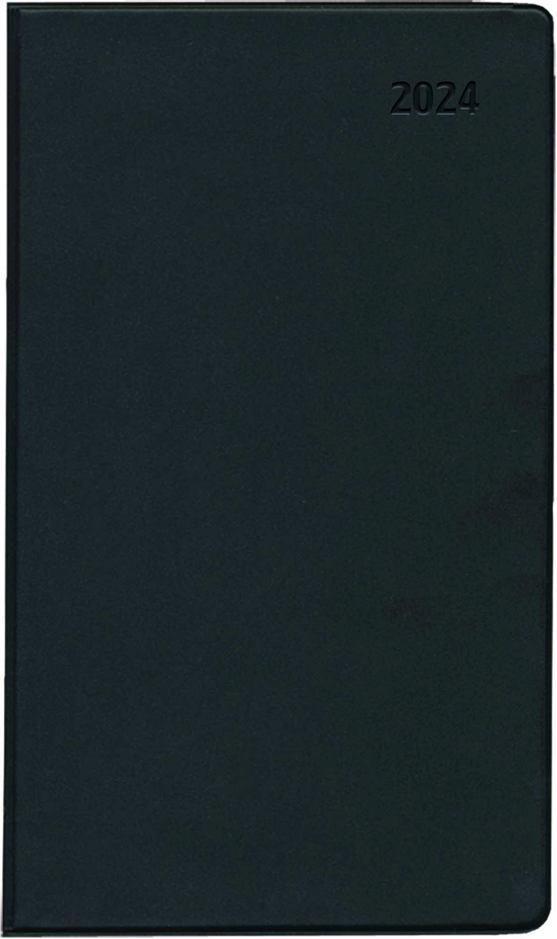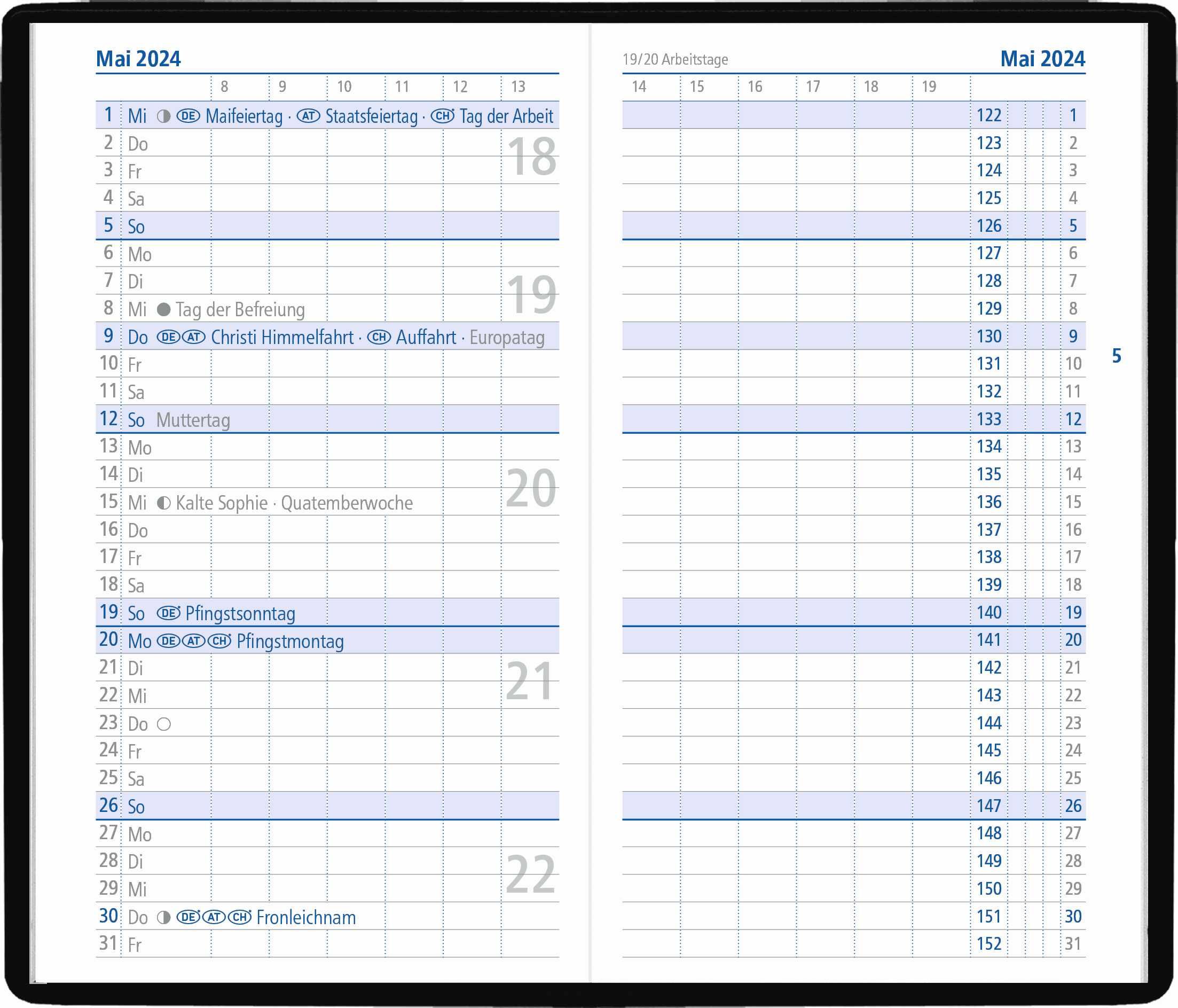 1 Monat/2 Seiten, Sonn- und Feiertage hervorgehoben, Arbeitstage-, Tages- und Wochenzählung, Mondphasen. 32 Seiten, Telefon-/Adressverzeichnis. Geheftet, eingesteckt in Kunststoffhülle. Anschriftenverzeichnis als Hefteinlage. Blattgröße: 90 x 150 mm (B x H). Stundeneinteilung 7 - 20 Uhr. Kalendarium deutsch. Eckperforation. Einband aus Kunststoff. PEFC-zertifiziert. Größe: 95 x 160 mm (B x H). Druckfarbe: schwarz/blau. Einband: schwarz.