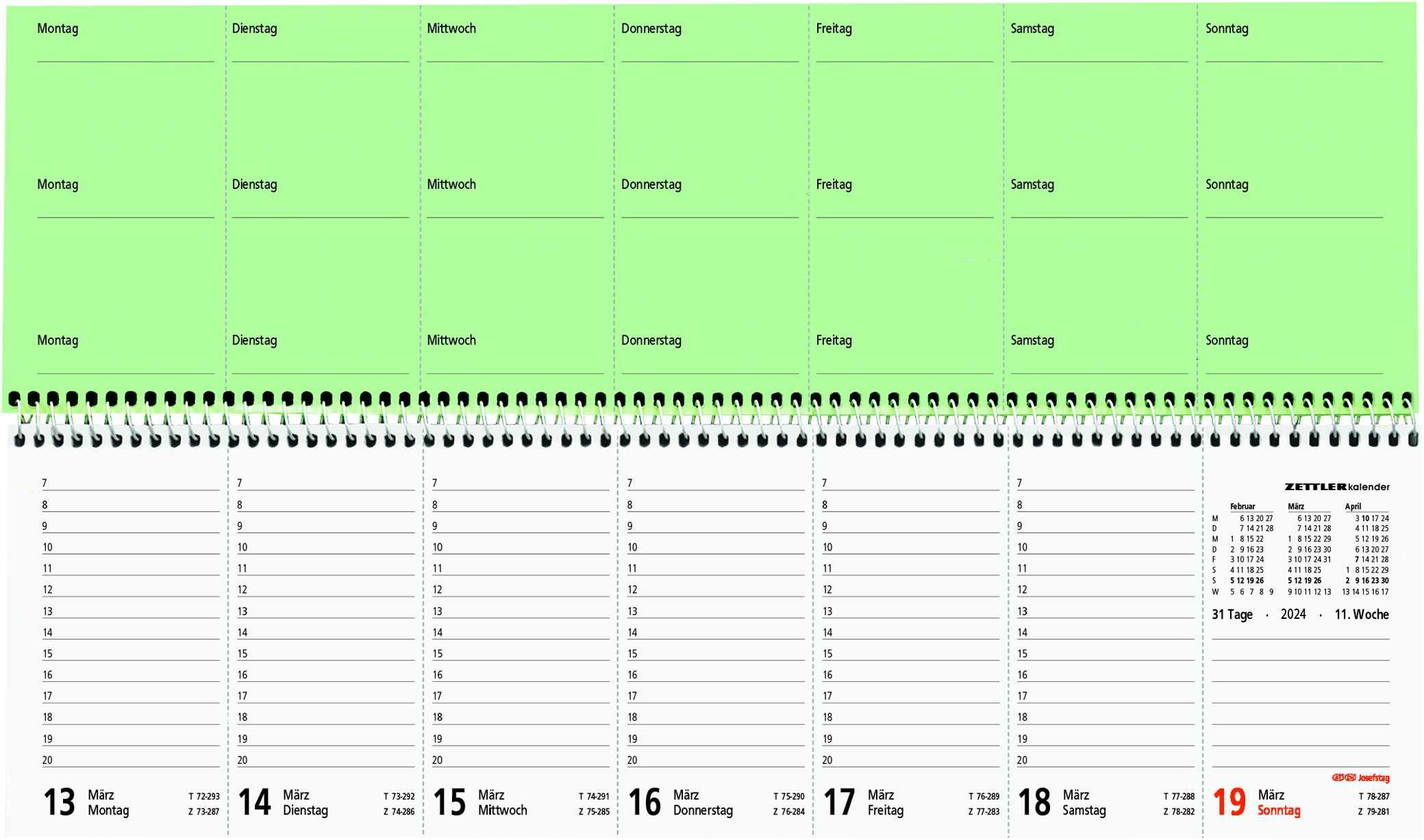 1 Woche/2 Seiten, Sonn- und Feiertage hervorgehoben, Tages- und Zinstagezählung, Dreimonatsübersicht, Steuertermine, 112 Seiten. Abwechselnd grün/weißes Papier, tageweise perforiert, Stundeneinteilung 7 - 20 Uhr, Wochenzählung, Spiralbindung. Druck: schwarz/rot. Blattgröße: 362 x 106 mm (B x H). Kalendarium deutsch. Einband aus Karton. Einband: blau, Jahreszahl in weiß.