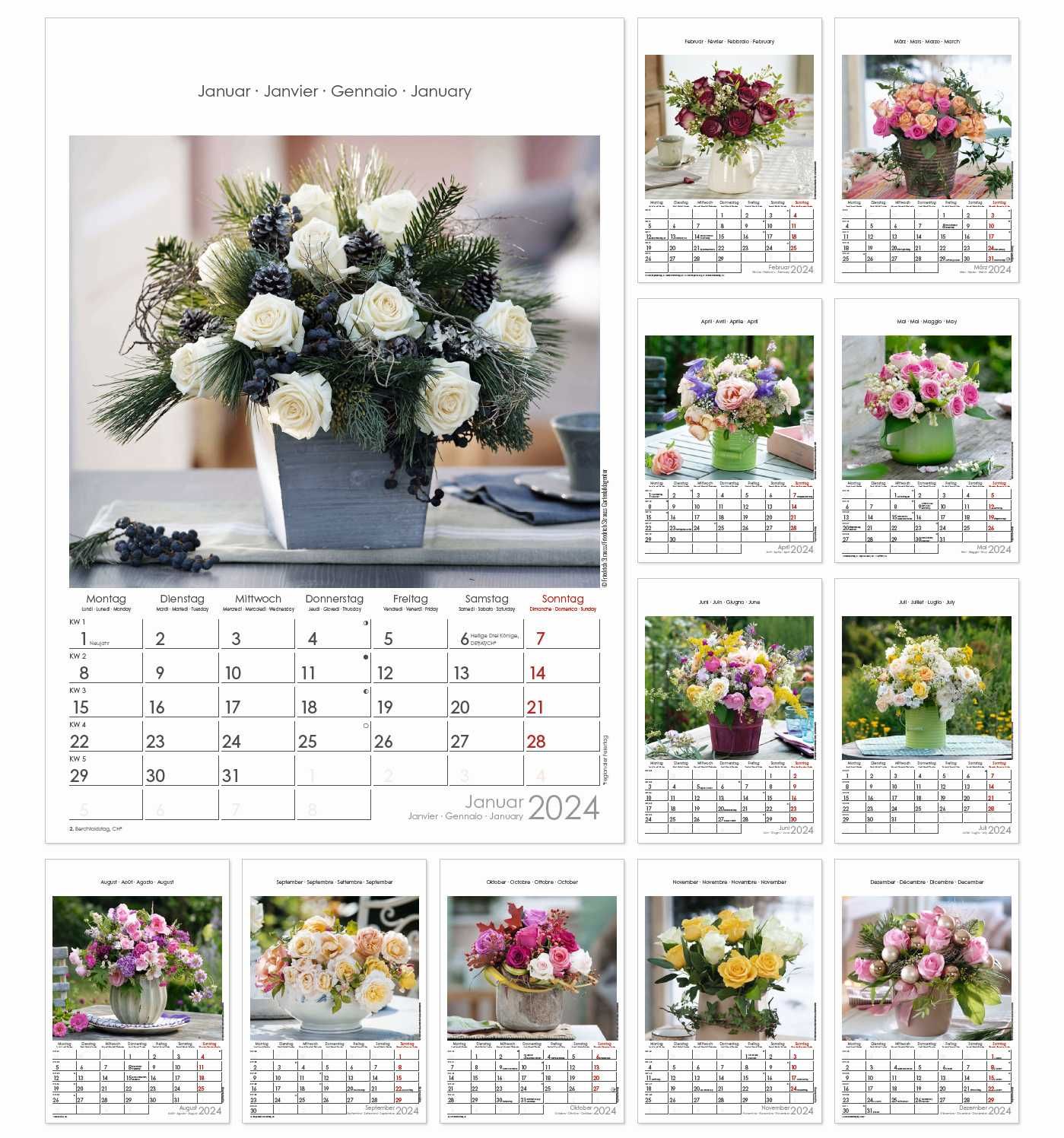 Ein schöner Wandkalender für alle, die Blumen lieben und sich an ihrer Pracht nicht sattsehen können. Dank des Bild-Formats von 23,7 x 34 cm kommen die Rosennarrangements auf den Fotos perfekt zur Geltung. Zudem liefert das übersichtliche Kalendarium unter den Fotomotiven Monat für Monat viele Zusatzinformationen und lässt sogar Platz für Notizen. Dieser Rosenkalender ist ein echter Blickfänger und schmückt jeden Raum. Mit Platz für Notizen. Auf den Rückseiten u. a. Jahresübersichten, 100-jähriger Kalender, ein Pollenflugkalender und Ferientermine (DE/AT/CH).