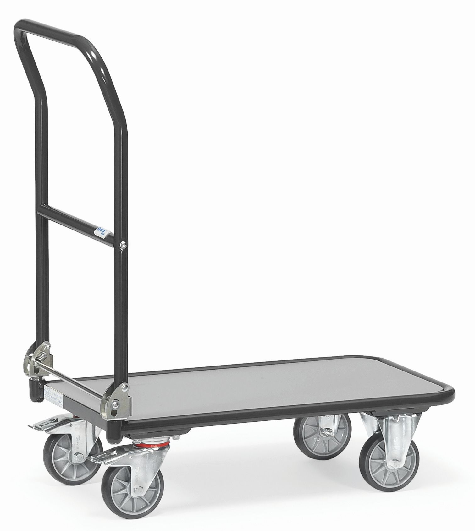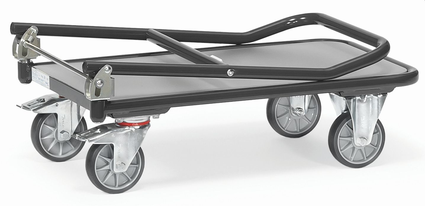 Klappwagen, Stahlrohr-Konstruktion, pulverbeschichtet, RAL 5007 Brillantblau, mit Holzwerkstoffplatten, Oberfläche Buchendekor. Schiebebügel auf Plattform klappbar. 2 Lenk- und 2 Bockrollen, Naben mit Rillenkugellager. Feststeller an den Lenkrollen. Räder mit TPE-Bereifung (thermoplastisches Elastomer) bieten auf ebenen Böden viele Vorteile. Der Kraftaufwand für Transporte minimiert sich spürbar: mit leichtem Aufwand können selbst schwere Lasten komfortabel, sicher und geräuscharm bewegt werden. Die fetra-TPE-Rolle mit Präzisions- Rillenkugellager im geschützten Design ist gemäß EU-Verordnung PAK konform.