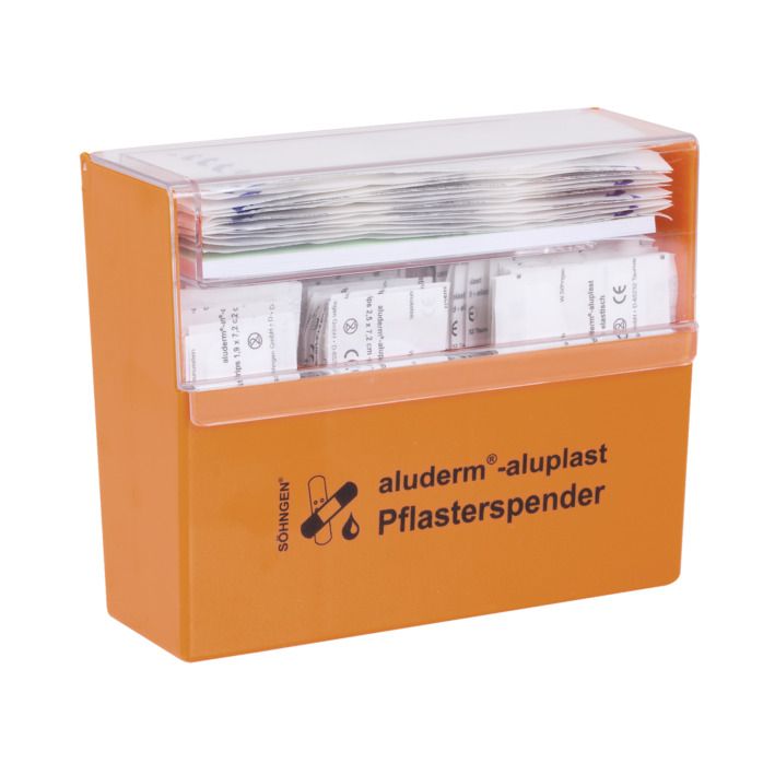 Spender gefüllt mit 115 aluminiumbedampften aluderm®-aluplast Wundverbandpflastern, elastisch, in den fünf am häufigsten benötigten Größen:- 30 Strips 72 x 25 mm - 30 Strips 72 x 19 mm - 25 Fingerkuppenverbände - 20 Fingerverbände 120 x 20 mm - 10 Fingergelenkverbände - Miniblock Notfallversorgungsnachweis - Spender aus ABS-Kunststoff einschließlich Wandhalterung und Befestigungssatz - Maße: 160 x 122 x 57 mm - Korpus orange, mit drei Fachabteilungen, transparenter Klappdeckel mit Tunnelfach - Durch seine Wandhalterung hat der Spender einen festen Aufbewahrungsplatz, langes Suchen entfällt - Er kann mit einem Griff schnell entnommen werden und so überall verfügbar sein aluderm®-aluplast ist das besondere Wundverbandpflaster mit aluminiumbedampfter aluderm®-Wundauflage. aluderm® verklebt nicht mit der Wunde, fasert nicht, ist stark saugend, kann bei der Hautbildung und Heilung helfen, ist atmungsaktiv. aluderm®-aluplast elastisch: Trägermaterial hochelastisches Polyestervlies, weiß, besonders hautfreundlich, gut luftdurchlässig, wasserabweisend. Der Polyacrylatkleber wird durch Körperwärme zusätzlich aktiviert. Besonders anschmiegsam, passt sich allen Bewegungen an, hypoallergen, reizfrei.