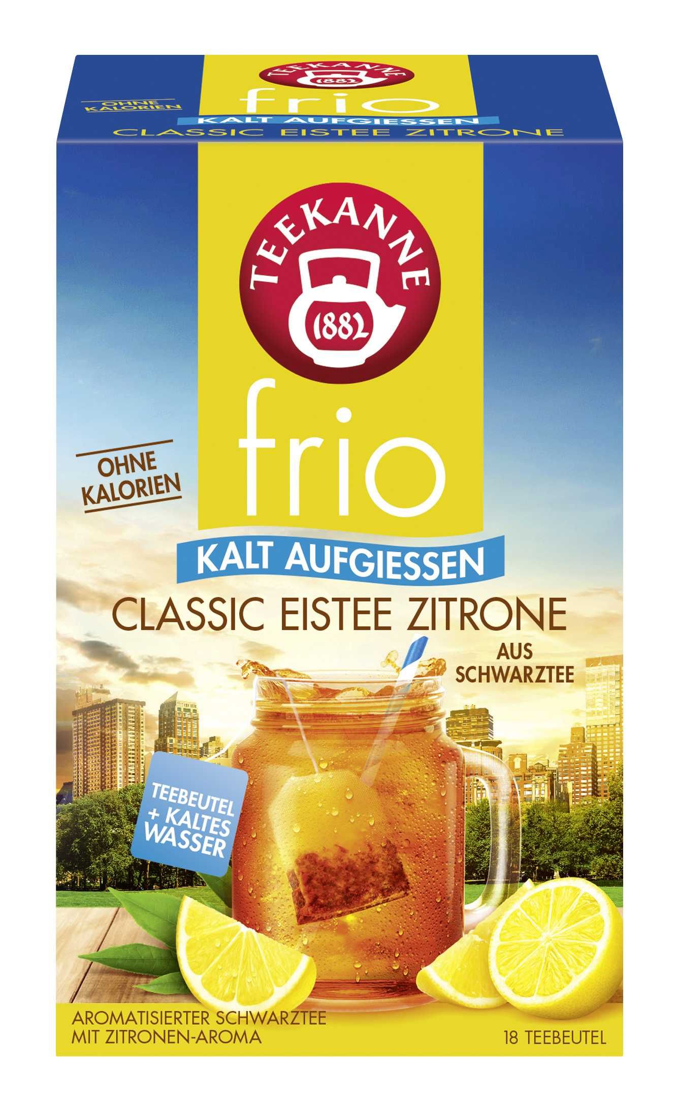 Genieße den Evergreen unter den Eistees: mit TEEKANNE frio® Classic Eistee Zitrone. Schnell mit kaltem Wasser aufgegossen, erfüllt Dich der Zitronen-Eistee schon bald mit kühler Frische. Dein Genuss im Sommer heißt frio® Classic Eistee Zitrone. Inhalt: 18 Beutel à 2,5 g. Zubereitungs-Hinweis: Teebeutel mit kaltem Leitungswasser aufgießen und 5-8 Minuten ziehen lassen. Den Tee nach der Zubereitung zeitnah verzehren. Nimm für eine Tasse 1 Teebeutel und mindestens 3 Teebeutel für eine Kanne.