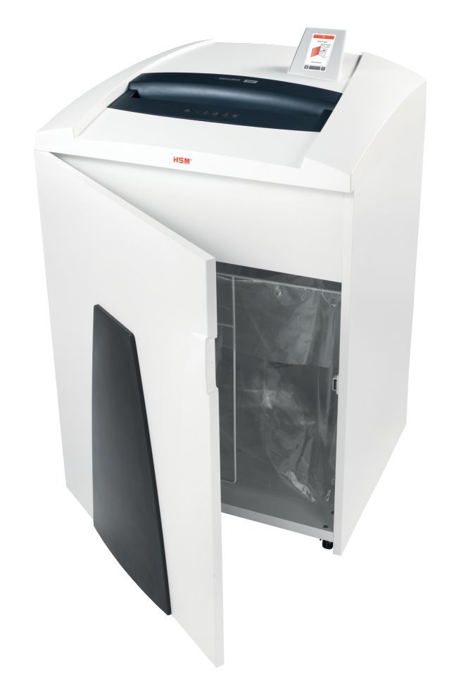 Partikelschnitt 1,9x15mm, geeignet für Papier, Heftklammer, Büroklammer, Kreditkarte, CDs, Disketten, USB-Stick, Schnittleistung bis zu 27 Blatt 80g, Eingabebreite 400 mm, Sicherheitsstufe Papier P-5, CDs/DVDs O-4, Auffangvolumen 205 Liter, Gewicht 105 kg, Größe: 70 x 110,5 x 59,2 cm, Farbe: weiß. Der Top-Aktenvernichter der HSM SECURIO Linie mit IntelligentDrive und Touchdisplay. Dieses Kraftpaket mit 205 Litern Auffangvolumen verarbeitet zuverlässig große Papiermengen und ist damit bestens geeignet für Abteilungen. Innovatives Antriebs- und Bedienkonzept IntelligentDrive bietet die Betriebsmodi Silent, Standard und Performance für eine effiziente und komfortable Datenvernichtung. Intuitive Bedienung und Menüführung über das hochauflösende Touchdisplay. Sehr energiesparend durch Stand-by und Abschalt-Automatik. Intelligente Behebung von Papierstau. Das Gerät erkennt frühzeitig ob zu viel Papier zugeführt wurde und reagiert selbständig. Hochwertige Materialien und Qualität "Made in Germany" für Sicherheit und Langlebigkeit. Schneidwellen aus gehärtetem Vollstahl. Partikellschnitt mit integriertem automatischem Öler, für konstant hohe Schnittleistung. Der kraftvolle Motor ermöglicht dauerhaften Betrieb. Bei Druck auf das Sicherheitselement schaltet das Gerät automatisch ab. Lichtschranke für automatischen Start/Stopp. Mobil auf Rollen fahrbar. Komfortables Entnehmen und Leeren des herausziehbaren Mehrweg-Auffangbeutels. Tastensperre verhindert unbeabsichtigte Nutzung. Hochwertiger Holzunterschrank mit Tür. Füllstandkontrolle durch Sichtfenster.