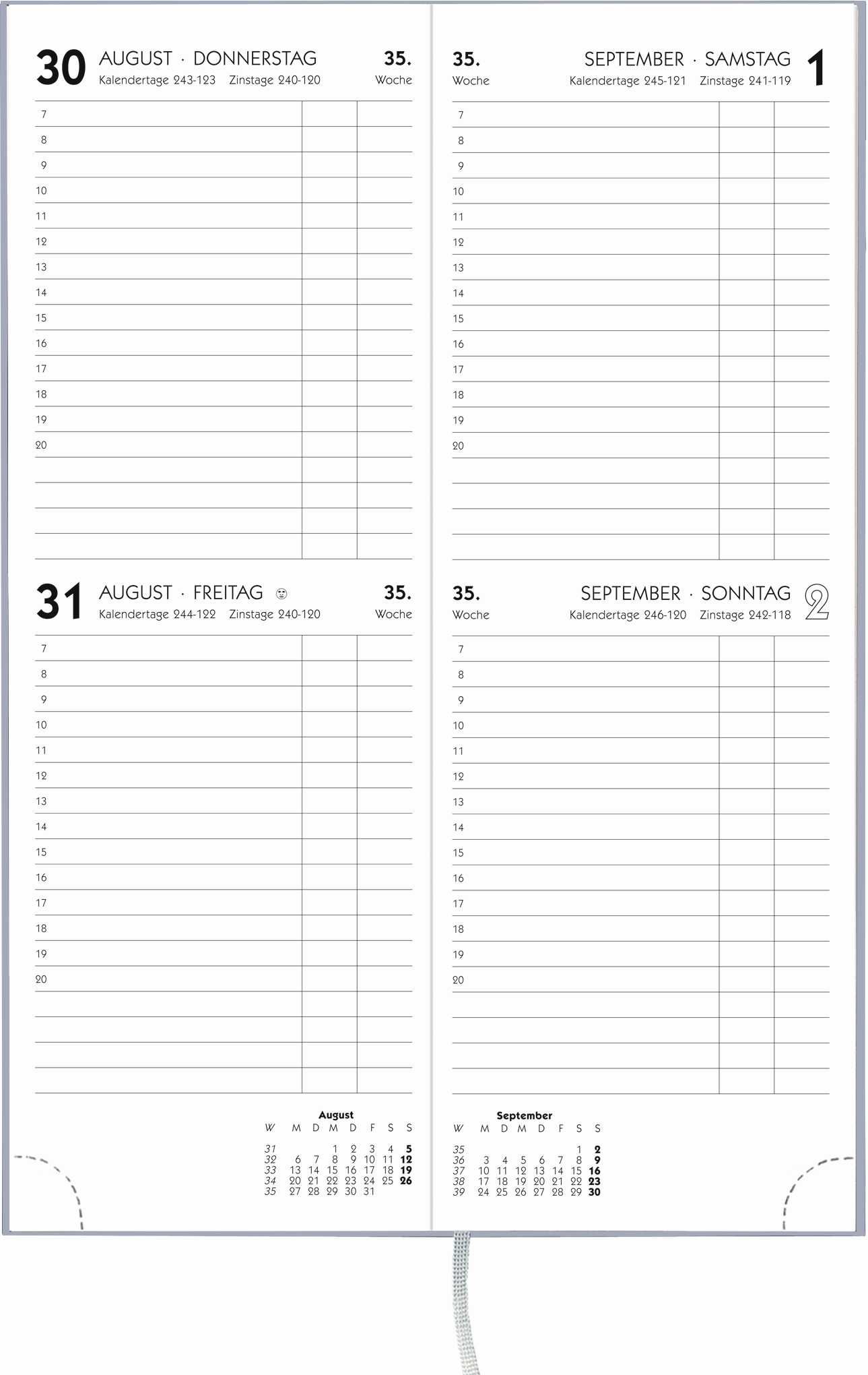 2 Tage/1 Seite, Sonn- und Feiertage hervorgehoben, Zweimonatsübersicht, Steuertermine. Gesamtumfang: 200 Seiten. Mit Vormerkkalender, Jahresübersichten, Ferienterminen sowie Wissenswertem. Gebunden. Stundeneinteilung: 07 - 20 Uhr. Tages-, Wochen- und Zinstagezählung. Sprache: deutsch. Mit Eckperforation/Lesezeichen. Druck: grau. PEFC-Zertifizierung. Einband: Kunststoff mit Leinenstruktur. Weiße Jahreszahl.