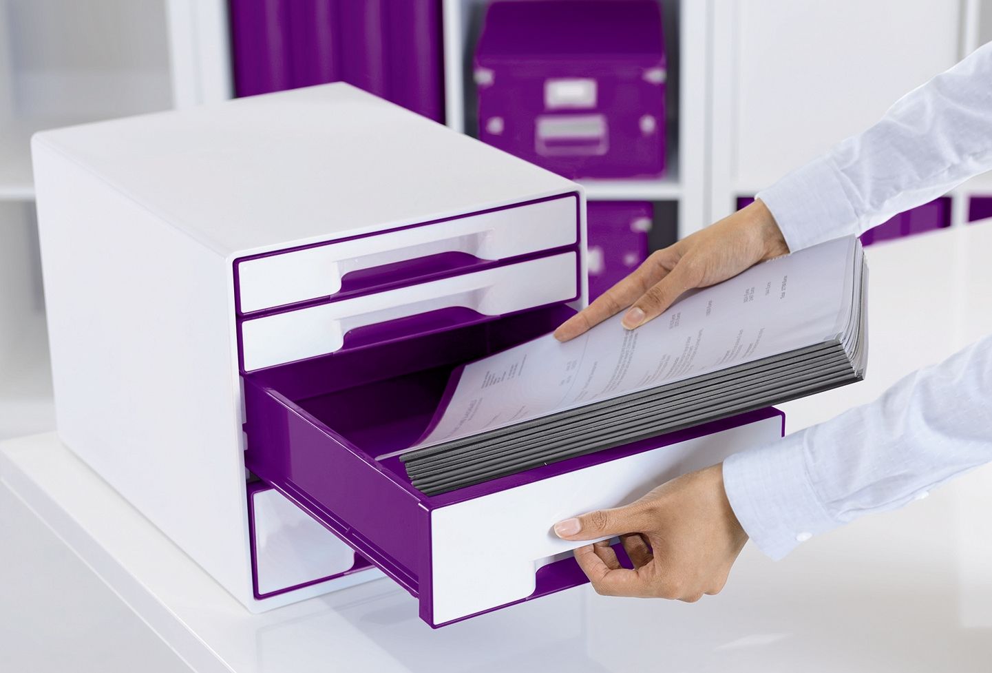 Leitz Schubladenbox WOW CUBE, mit 4 Schubladen, geschlossen, 2 hohe und 2 flache Schubladen. Mit Griffloch im Schubladenboden der flachen Schubladen für die einfache Entnahme von Dokumenten, ergonomischer Griffmulde in der Schubladenfront, mit integrierten Beschriftungsschildchen, inklusive Schubladeneinsatz. Leicht laufende Schubladen mit Auszugssprerre, mit rutschfesten Gummifüßchen, stapelbar. Material: Polystyrol. Format: 363 x 287 x 270 mm, für A4. Farbe: Gehäuse: perlweiß, Schubladen: violett metallic.