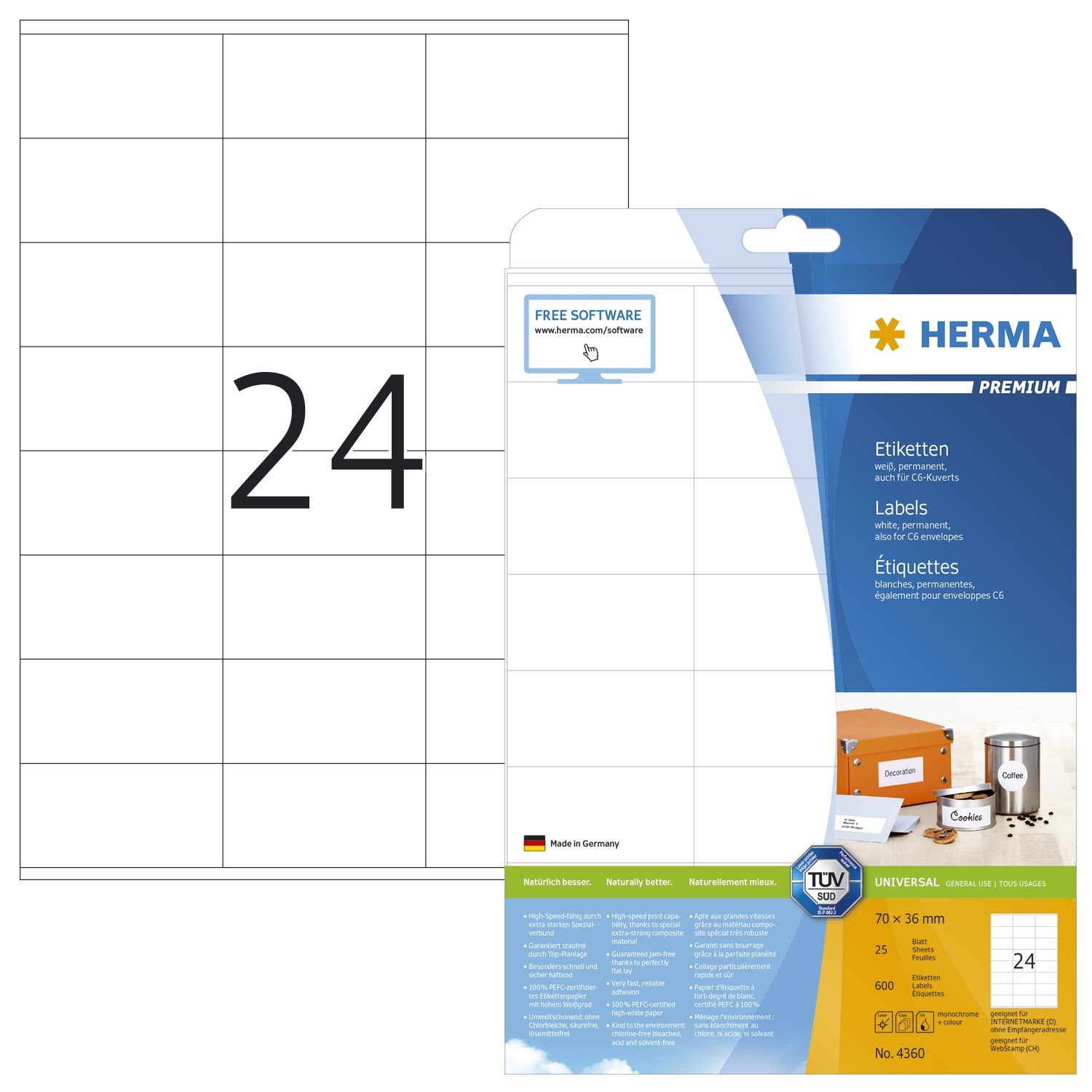 Selbstklebende Etiketten auf A4-Blättern, permanent haftend. Perfekt für alle Laser- und Inkjetdrucker, Kopierer, Farblaserdrucker und Farbkopierer. Hoher Weißgrad und gleichmäßige Oberfläche für beste Druckergebnisse in Schwarz und Farbe. Spürbar dicker: extra starke Etiketten - einfaches Aufkleben. Besonders schnell und sicher haftend, auch auf kühlen und feuchten Oberflächen. Garantiert staufrei und high-speed-fähig durch extra starken Spezialverbund, Top-Planlage und Rundum-Sicherheitskante. Umweltschonend und nachhaltig: chlorfrei gebleicht, lösemittelfreier Haftkleber. Etiketten sind 100 % recyclingfähig mit dem Altpapier, Verpackung aus Recyclingkarton.