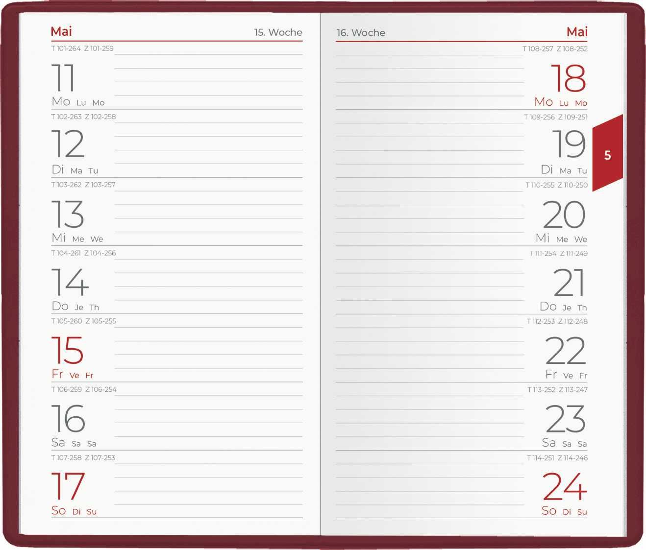 1 Woche/1 Seite, Sonn- und Feiertage hervorgehoben, Mondphasen, Sonnen- und Mondzeiten. 64 Seiten, geheftet. Blattgröße: 90 x 150 mm (B x H). Wochenzählung. Kalendarium deutsch. Eckperforation. Einband aus Karton. PEFC-zertifiziert. Druckfarbe: grau/rot. Einband farbig sortiert mit Motiv.