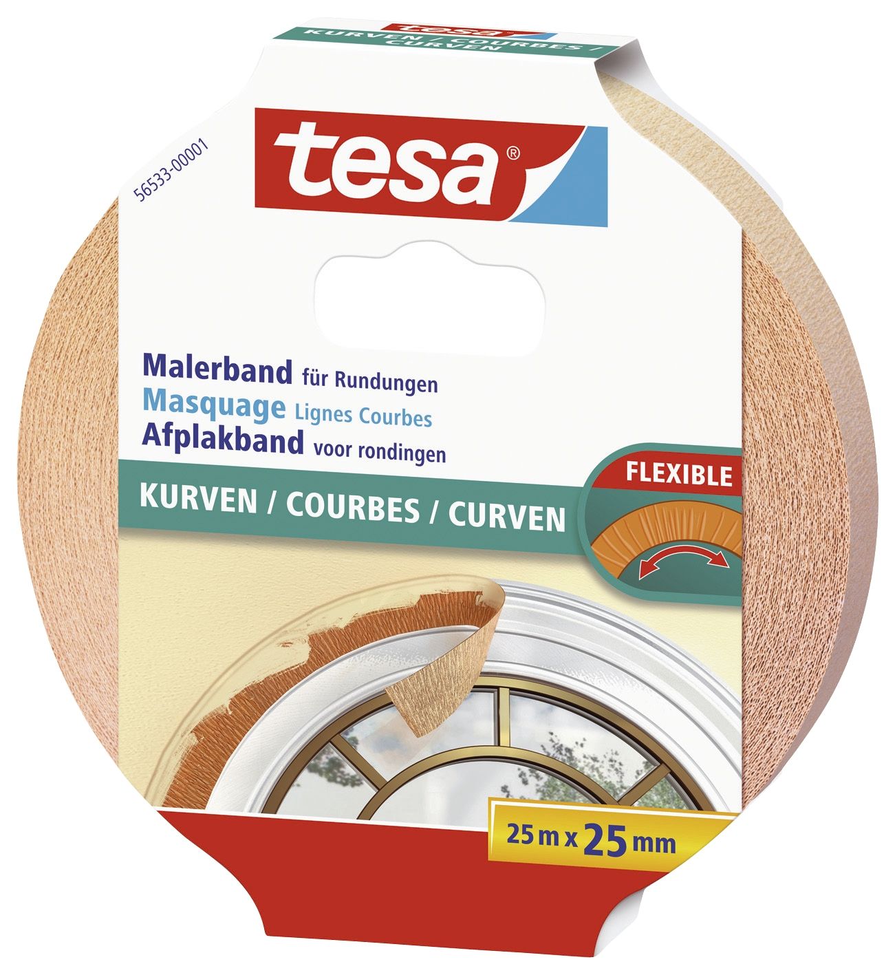 Papier-Klebeband tesa® Maler-Krepp für Rundungen. Einsatzbereich: Innenbereich. Produktverwendung: Abdecken von Rundungen. Rückstandsfrei entfernbar im Innenbereich bis zu 7 Tagen. Bandgröße (L x B): 25 m x 25 mm. Farbe: beige.