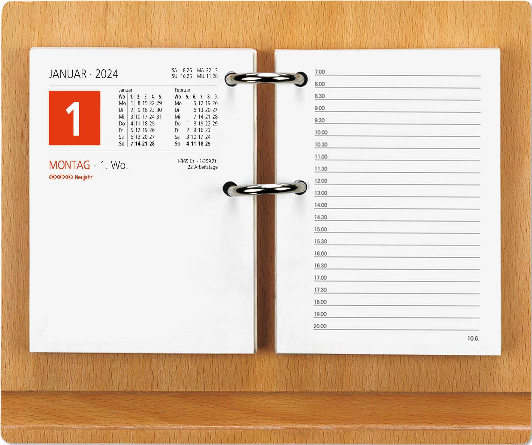 Kalendergestell mit zwei Metallbügeln, 38 mm Lochabstand und Stiftablage. Schrägstellung möglich. Aus Holz, hellmattiert. Für Umlegekalender 336. Größe: 185 x 155 mm (B x H). Stärke: 30 mm. Farbe: braun.