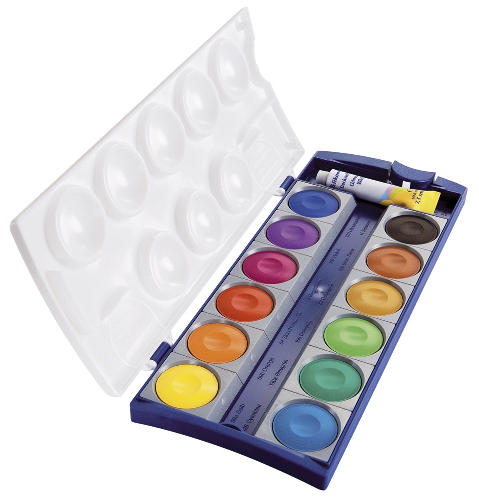 Die Nr. 1 in der Schule. Nach DIN 5023. Von Lehrern empfohlen. Unterstützt die lernplangerechte Farbenlehre. Starke Deckkraft. Gute Haftung. Lichtechte Pigmente. Auswechselbare Farbschälchen. Deckel mit vielen Mischtöpfchen. Beschriftbares Namensfeld.