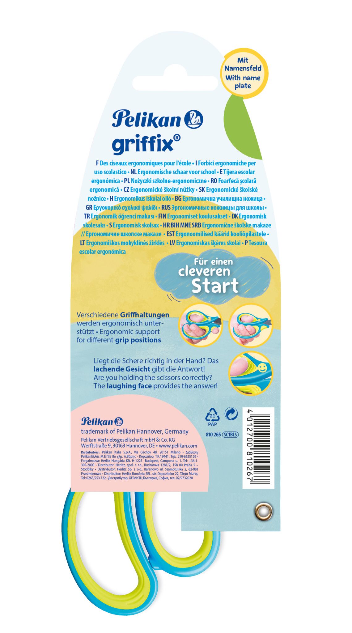 Eltern und Lehrer wünschen sich Qualitätsscheren in der Schule, die sich durch lange Haltbarkeit und Robustheit auszeichnen. Ergonomie und leichtes Handling für die Kinder stehen außerdem im Vordergrund. Mit der Einführung der griffix® Schulschere hat Pelikan ein hochwertiges Qualitäts- produkt auf den Markt gebracht, das all diese Eigenschaften in sich vereint. Die perfekte Ergänzung für das griffix® Schulscherensortiment ist die neue griffix Schulschere mit spitzer Klingenform. Beide Scherenvarianten sind im Schulunterricht relevant und fördern insbesondere die Feinmotorik der Kinder. Damit unterstützen die griffix® Schulscheren das beliebte griffix®-Schreiblernsystem für Grundschulkinder. Weil der Anfang wichtig ist!
