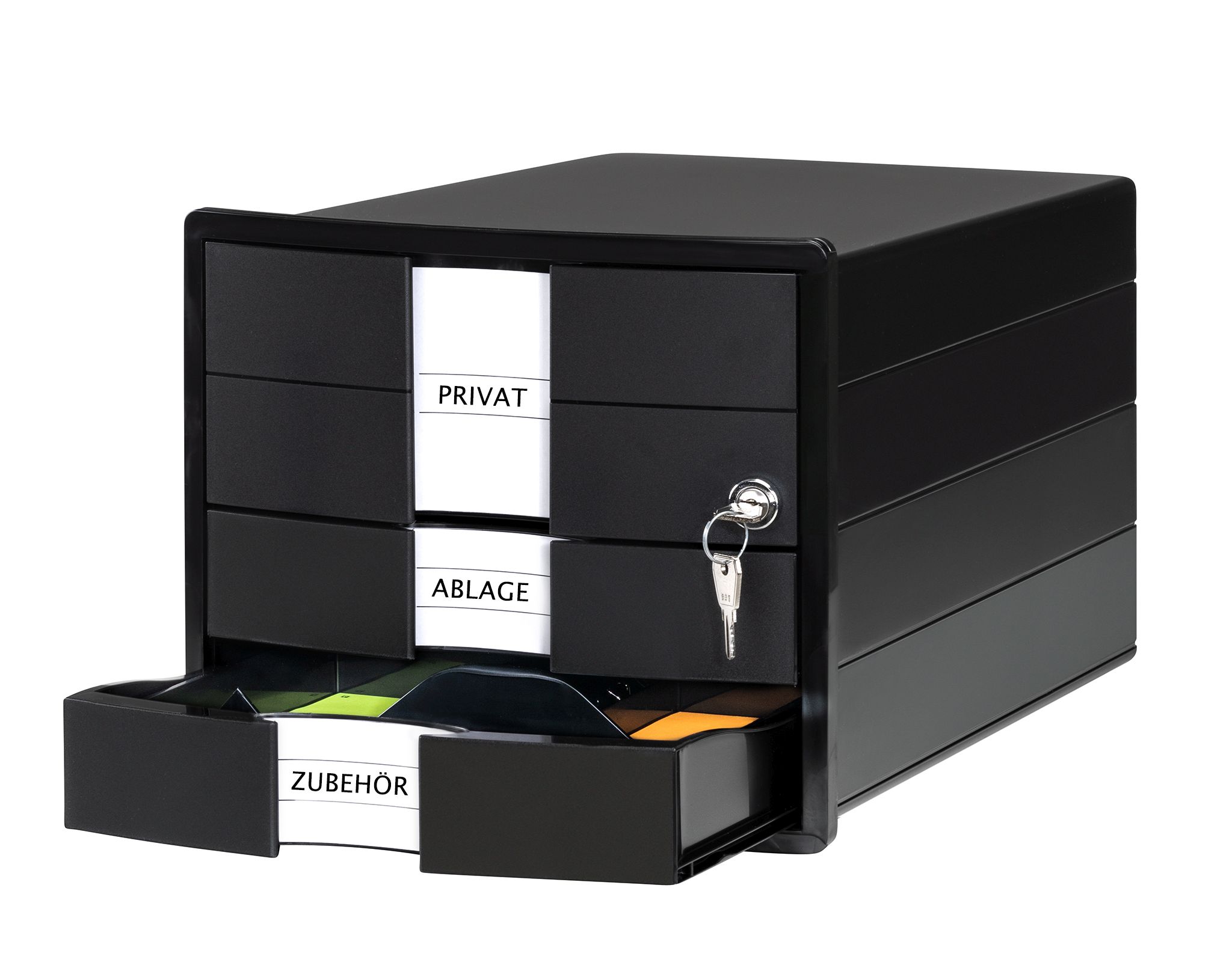 Schubladenbox IMPULS mit modernem Gehäusedesign. Mit 3 geschlossenen Schubladen (2 x Standard, 1 x extrahoch inkl. Schloss) für Papierformate DIN A4/C4. Innovatives, attraktives Design in höchster Qualität. Inkl. auswechselbarer Beschriftungsschilder mit hochwertiger Klarsichtabdeckung für ein einfaches Auffinden von Unterlagen. Leichtlaufende Schubladen mit Auszugssperre und durchgängig geschlossenem Boden. Extra stabile Gehäuseausführung mit optimierter Stapeltechnik. Rutschfeste, möbelschonende Gummifüße sorgen für einen sicheren Stand. Inkl. innovativem Schubladeneinsatz mit 6 unterschiedlich großen Fächern und Griff, der auch perfekt auf die Box mit der integrierten Stapelrippe gestellt werden kann. Die obere, extrahohe Schublade ist mit einem Zylinderschloss versehen und dadurch abschließbar. 2 Schlüssel sind im Lieferumfang enthalten. Ideal für die Aufbewahrung von vertraulichen Informationen und persönlichen Gegenständen. Made in Germany. Außenmaße (B x T x H): 280 x 367 x 235 mm. Innenmaße der Standard Schubladen (B x T x H): 240 x 325 x 37 mm, Innenmaß der extrahohen Schublade (B x T x H): 240 x 325 x 95 mm, daher ein hohes Fassungsvolumen. Material: hochwertiger Kunststoff, Polystyrol (PS). Farbe des Gehäuses: schwarz. Farbe der Schubladen: schwarz. Farbe des Schubladeneinsatzes: schwarz.