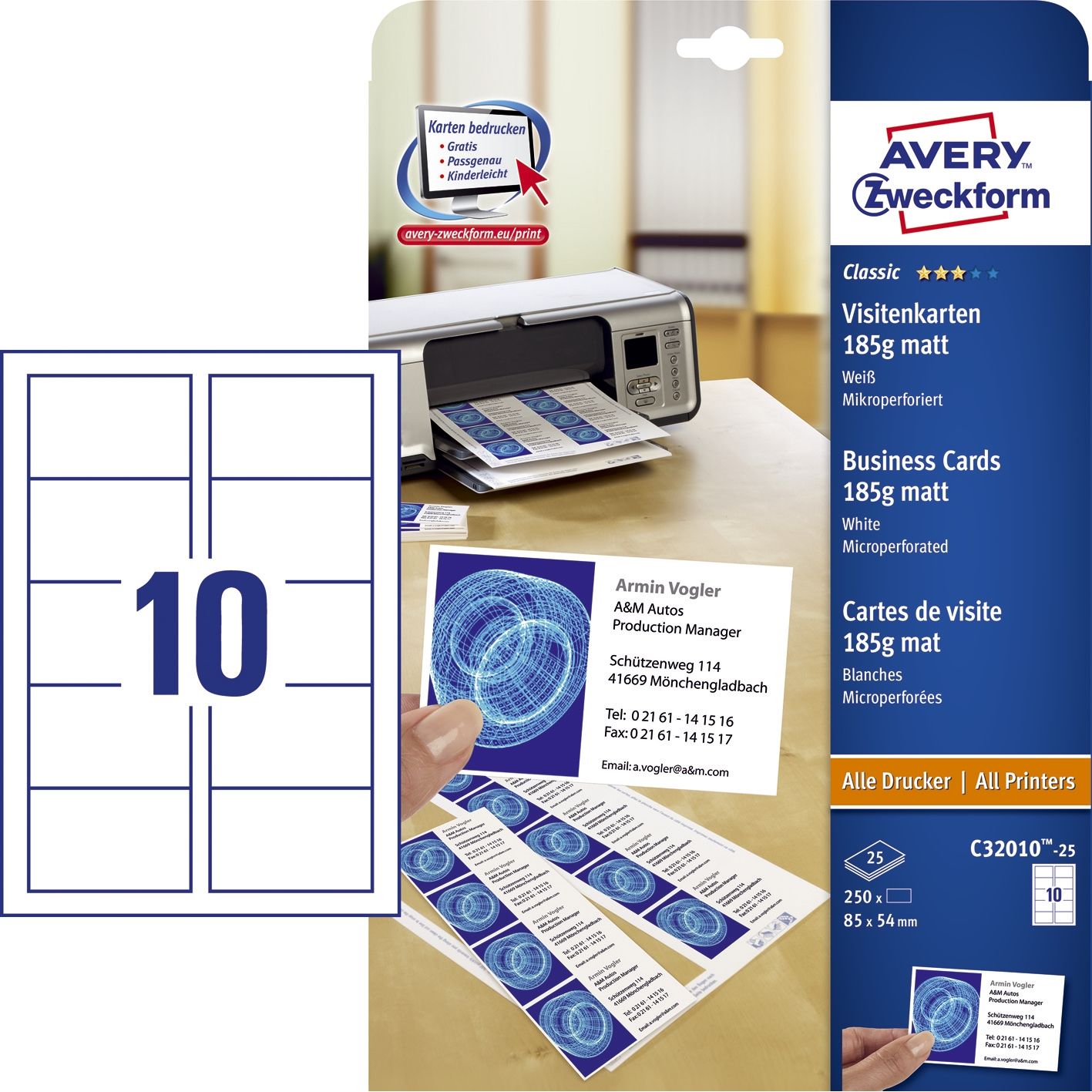 Gestalten und drucken Sie Ihre Visitenkarten selbst und vermeiden Sie Wartezeiten bei externen Druckereien! Die Classic Visitenkarten von Avery Zweckform garantieren gute Druckqualität auf allen gängigen Druckertypen. Die beidseitig bedruckbare Visitenkarte, mit einer Grammatur von 185 g/m², ist mit einer extra-feinen Mikroperforation versehen und hat eine matte Oberfläche. Mit der Avery Zweckform Software Design & Print Online erstellen und drucken Sie Ihre Visitenkarten schnell und einfach am eigenen PC!