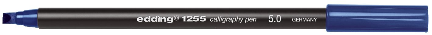 Kalligrafie-Stift edding 1255 calligraphy pen. Fasermaler mit schwarzem Kunststoffschaft und Kalligrafie-Spitze. Neue Spitze, weich schreibend und präzise geschliffen für kalligrafische Anforderungen. Die Kalligrafie Spitze ermöglicht verschiedene Strichbreiten in einem Modell. Sehr lichtbeständige Tinte. Permanente Tinte ist wasserfest auf fast allen Oberflächen. Tinte auf Wasserbasis. Strichstärke: 5,0 mm. Schreibfarbe: stahlblau. Made in Germany.