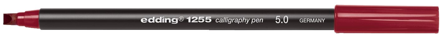 Kalligrafie-Stift edding 1255 calligraphy pen. Fasermaler mit schwarzem Kunststoffschaft und Kalligrafie-Spitze. Neue Spitze, weich schreibend und präzise geschliffen für kalligrafische Anforderungen. Die Kalligrafie Spitze ermöglicht verschiedene Strichbreiten in einem Modell. Sehr lichtbeständige Tinte. Permanente Tinte ist wasserfest auf fast allen Oberflächen. Tinte auf Wasserbasis. Strichstärke: 5,0 mm. Schreibfarbe: karmesin. Made in Germany.