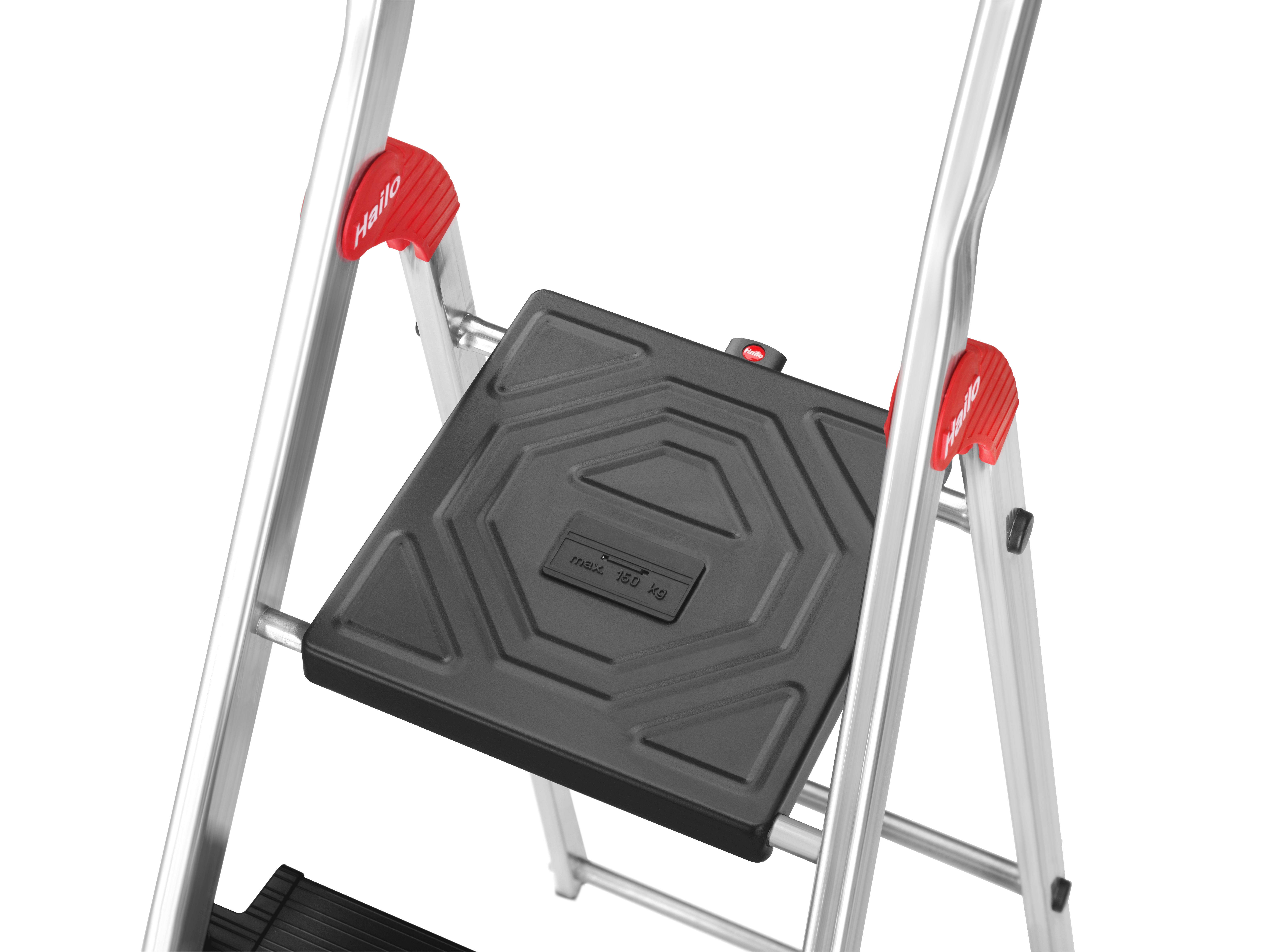 Hailo L100 TopLine. Die Alu-Sicherheits-Stehleiter mit Multifunktions-Schale, Sicherheits-Haltebügel und Plattformverriegelung bietet Sicherheit im XXL-Format: 13 cm extra tiefe Stufen. Geeignet für HAILO EasyClix Wechselfüße (optionales Zubehör) Plattformverriegelung für sicheres Ver- und Entriegeln Schwarze XXL-Alu-Stufen mit Anti-Rutsch-Riffelung und extra tiefer Standfläche Verzinkte, schwarze Stahl-Plattform mit Anti-Rutsch-Riffelung Ausziehbarer Sicherheits-Haltebügel zum Festhalten beim Arbeiten auf der Plattform Multifunktions-Ablageschale zur Ablage von Werkzeugen, Farbdosen oder Kleinteilen Eimerschlaufe mit Klick-Schnellverschluss zur sicheren Befestigung von Eimern, Staubsaugern oder Kabeltrommeln 1 Universalhaken als Halterung für Heckenscheren, Putzmittel oder Malerrollen 1 Stabhalter als Halterung für Besen oder Pflücker. Sichere, HighTech-vernietete Holm-Stufenverbindung. Rutschsicherer Steckfuß. Belastbar bis 150 kg.