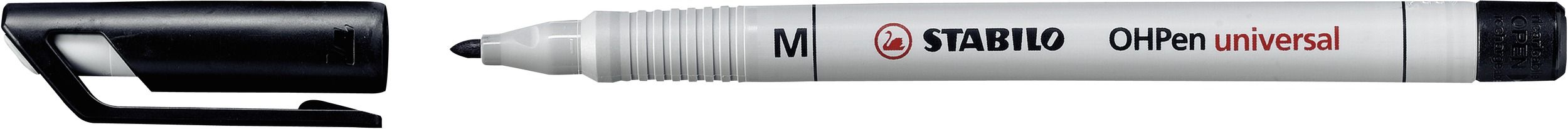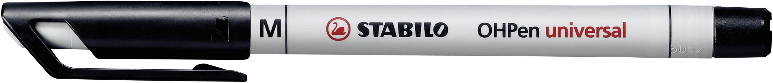 STABILO® OHPen universal. Folienstift für alle, die ihre Ideen vor anderen Menschen erläutern möchten. Schreibt auf fast allen glatten Oberflächen. Schwarzer Schaft für permanente Tinte, grauer Schaft für wasserlösliche Tinte. Rutschfeste Griffzone und praktischer Clip. Bis zu 72 Stunden Austrocknungsschutz ohne Kappe. Kappe am Stiftende aufsteckbar.