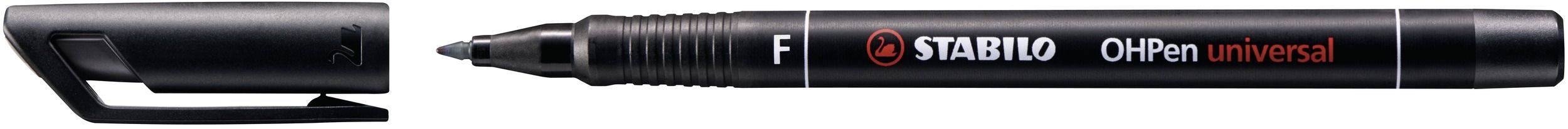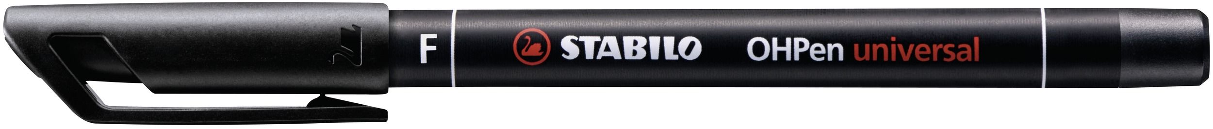 STABILO® OHPen universal. Folienstift für alle, die ihre Ideen vor anderen Menschen erläutern möchten. Schreibt auf fast allen glatten Oberflächen. Schwarzer Schaft für permanente Tinte, grauer Schaft für wasserlösliche Tinte. Rutschfeste Griffzone und praktischer Clip. Bis zu 72 Stunden Austrocknungsschutz ohne Kappe. Kappe am Stiftende aufsteckbar.