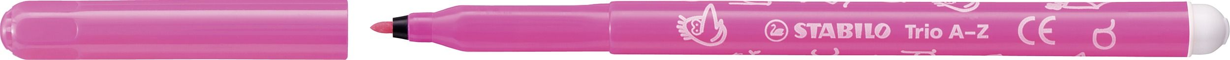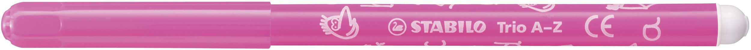 STABILO® Trio A-Z. Filzstift mit Dreikant-Griffzone, für alle, die in der Schule oder zu Hause mit Freunden gerne schöne Bilder mit coolen Stiften malen. Mit feiner F-Spitze (ca. 0,7 mm Strichstärke). Speziell zum Malen und Schreiben. Dreieckige ergonomische Griffzone. Fördert die korrekte, ermüdungsfreie Stifthaltung. Auswaschbare Tinte. Kappe am Stiftende aufsteckbar.