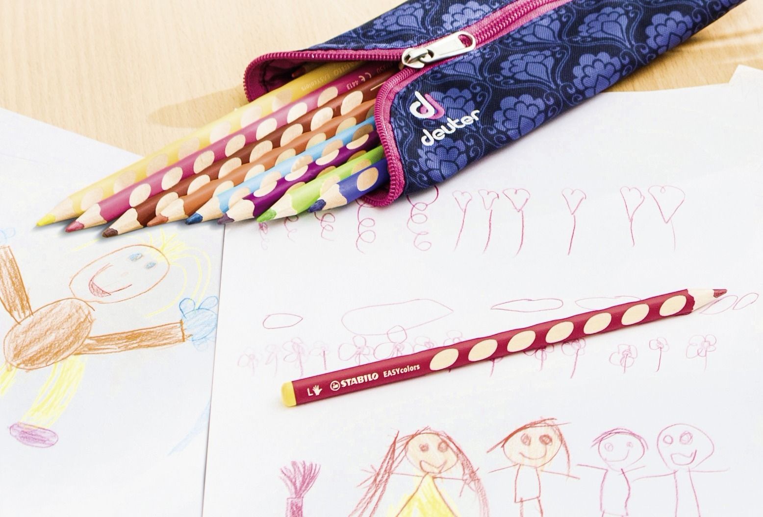 STABILO® EASYcolors. Ergonomischer Dreikant-Buntstift für Vorschulkinder und Schüler ab 5 Jahren. Erster ergonomischer Buntstift speziell für Links- und Rechtshänder. Dreikantform und rutschfeste Griffmulden sorgen für eine entspannte Handhaltung. Gelber oder roter Farbcode am Stiftende signalisiert linke bzw. rechte Ausführung. Brillante Farben in Holz aus nachhaltiger Waldwirtschaft. Jeder Stift mit Namensfeld.
