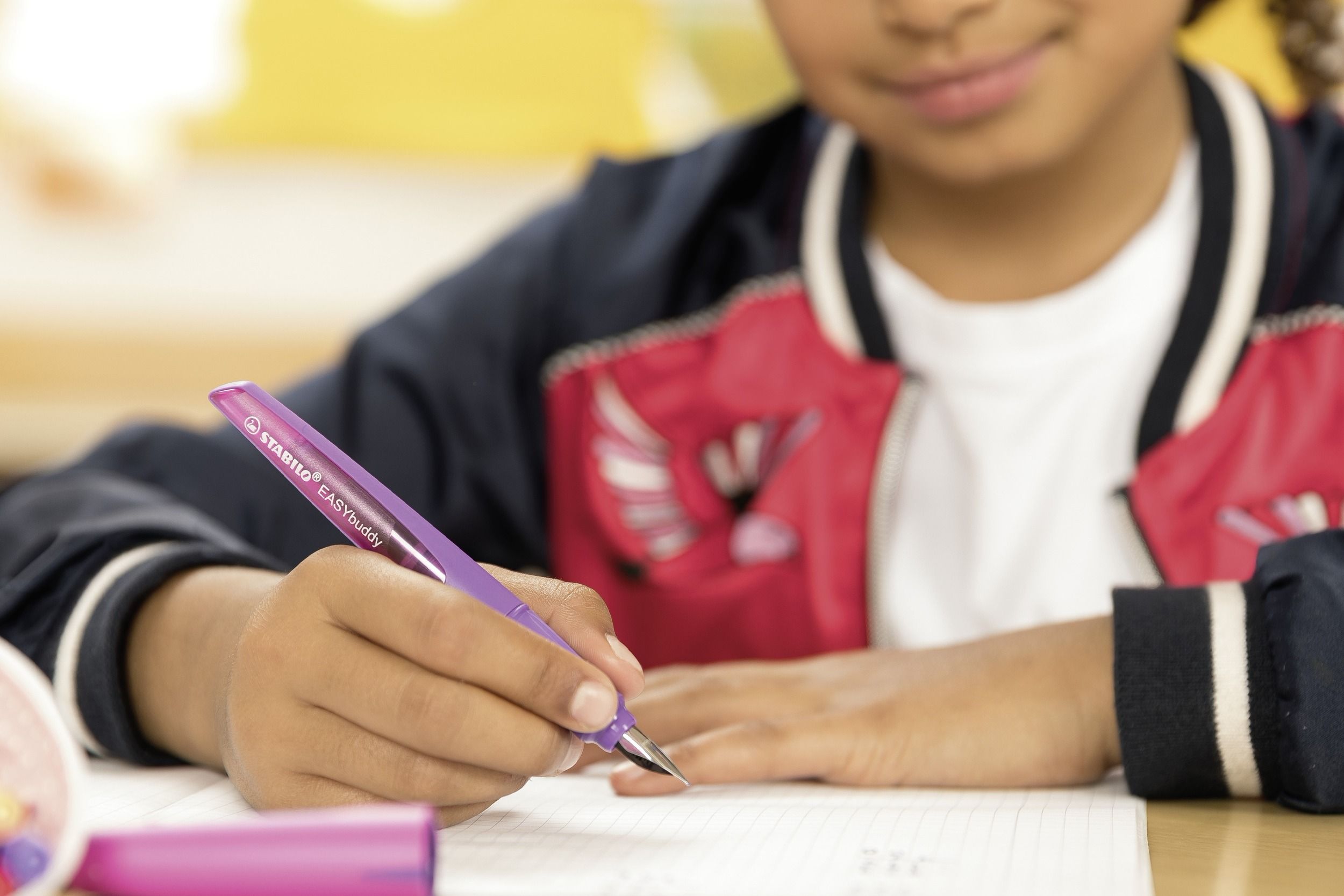 Der STABILO® EASYbuddy® ist der optimale Begleiter für kleine Helden und Heldinnen in der Grundschule. In ihm steckt das ganze Expertenwissen der STABILO® Ergonomie-Profis, sodass ihren Kindern das Finden der richtigen Schreibtechnik einfacher fällt und sie jede Menge Spaß am Schreiben haben. Die universelle, rutschfeste Soft-Griffzone des ergonomischen Schulfüllers sorgt für sicheren Halt, was ein entspannte Stifthaltung fördert und einem frühzeitigen Ermüden der Muskulatur vorbeugt. Eine für den STABILO® EASYbuddy® speziell entwickelte Technologie minimiert zudem das Risiko des Auslaufens der Tinte. Die Feder mit integriertem Iridiumkorn gibt es in Varianten für Anfänger, geübtere Schreiber und Linkshänder. So kann sie entsprechend der Bedürfnisse des Kindes (Schreibdruck, Neigungswinkel, Händigkeit) ausgewählt werden, was bei einer leichten Schreibführung hilft und ein sauberes Schriftbild fördert. Nachfüllbar ist der Füller mit zwei Standardpatronen oder einer Großraumpatrone. Das extra große Sichtfenster sorgt für die leichte Kontrolle des Tintenstandes bei beiden Patronen.