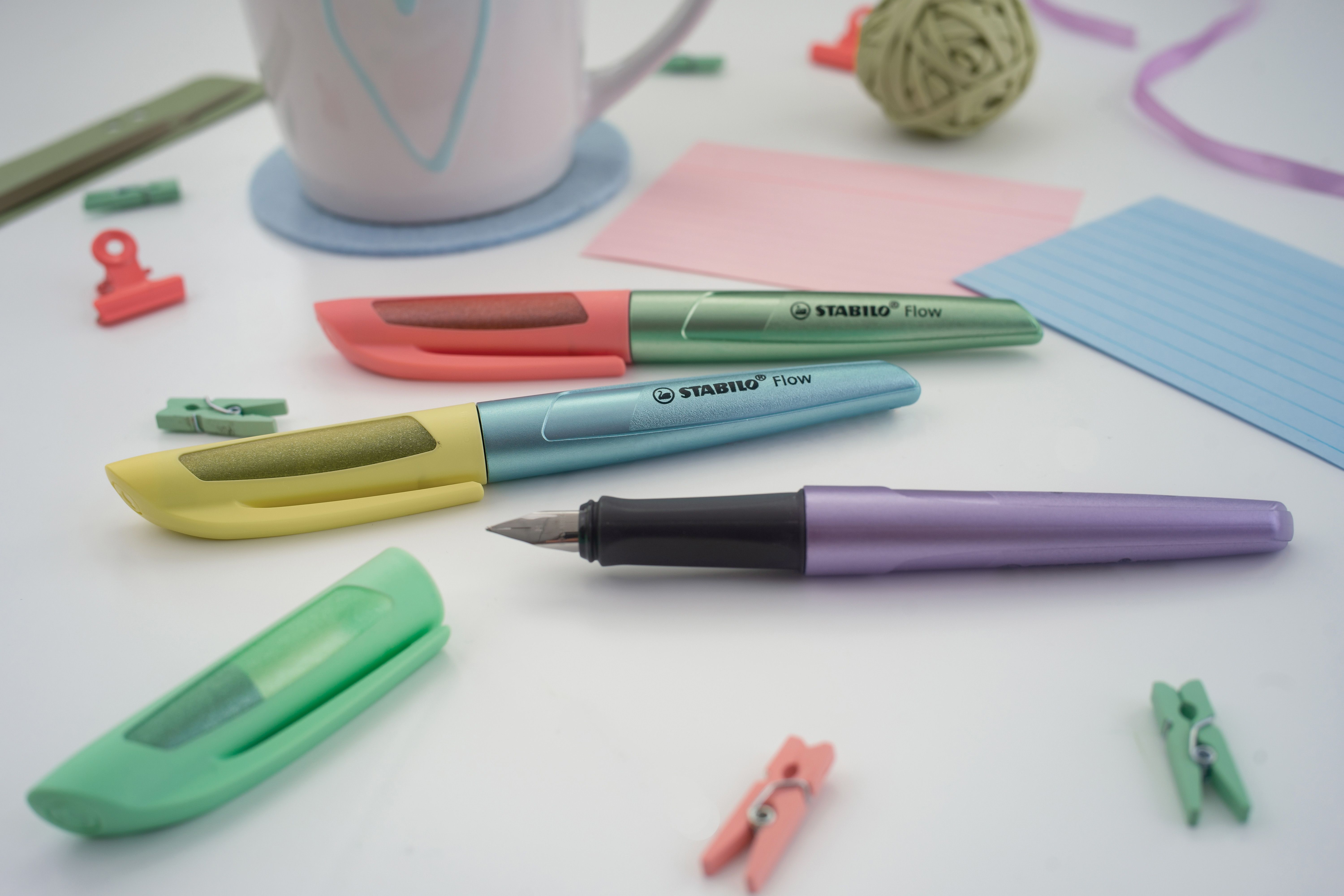 Der STABILO® Flow verbindet trendstarkes Farbdesign mit bewährter Qualität. Die drei Editionen SPORTY, COSMETIC und ACTIVE bringen neuen Schreib-Spaß in Schule, Uni und Büro. Da ist für jeden Geschmack etwas dabei. Durch die ergonomische Griffzone sind komfortables Handling und sicherer Halt garantiert – egal ob ungeübter Füller-Nutzer oder Profi. Die hochwertige Edelstahlfeder mit Iridiumkorn bringt die Handschrift besonders schön zur Geltung. Die gefederte Kappe bietet maximalen Auslaufschutz und schützt vor Tintenklecksen. Ebenso praktisch: Es passen sämtliche Standardpatronen.
