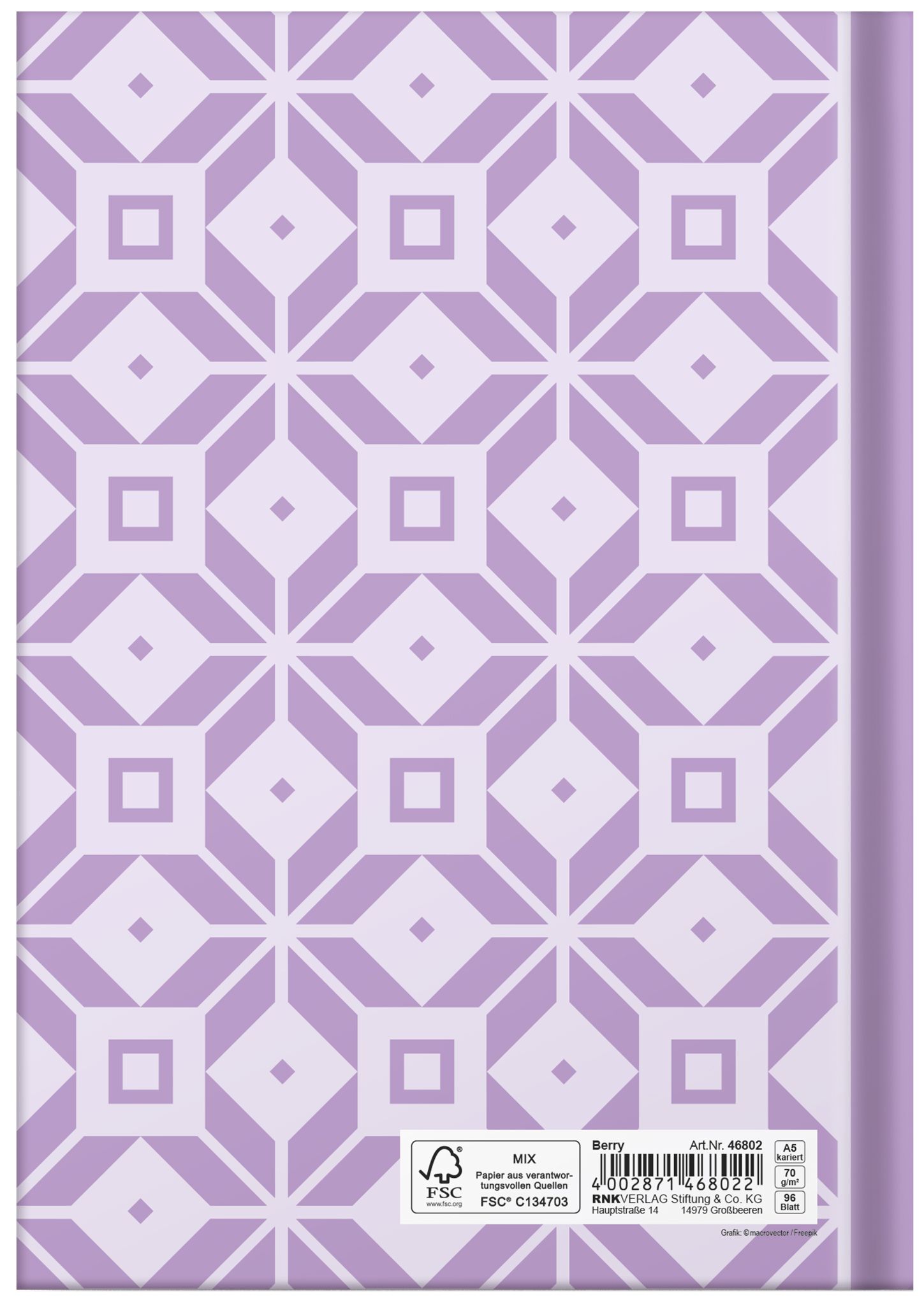 Kladde / Notizbuch "Berry", DIN A5, kariert. Ausführung Papier: Naturpapier, 70 g/m². Ausstattung: keine, Hardcover. Papierformat: DIN A5. Lineatur/Lineatur-Nr.: kariert, 5. Anzahl der Blätter: 96 Blatt. Farbe des Einbandes: lila.