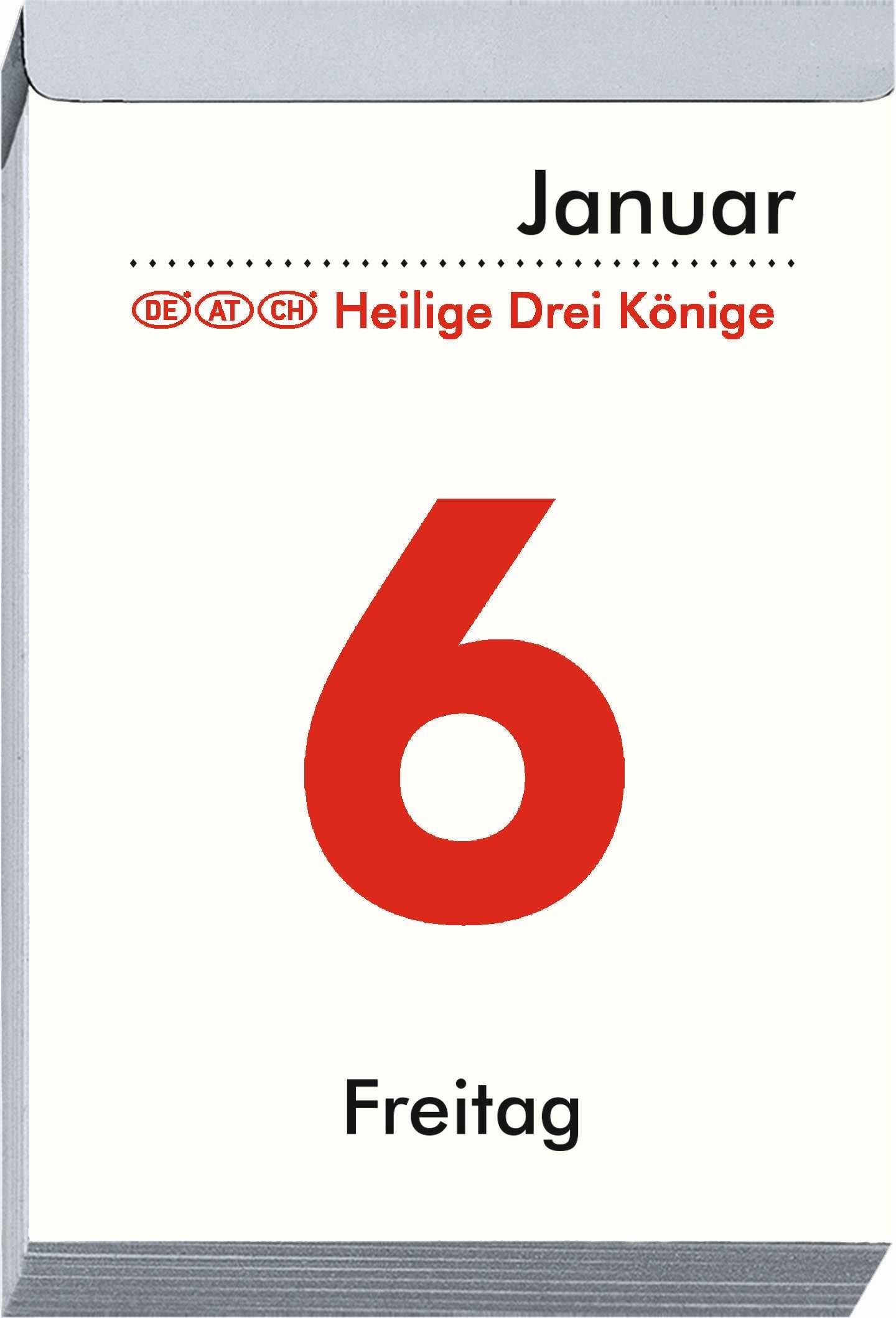 1 Tag/1 Blatt, Sonn- und Feiertage hervorgehoben, Druckfarbe: schwarz/rot. Mit Wochenzählung. Wissenswertes auf der Rückseite. Auf der Rückseite Sonnen- und Mondzeiten, Namenstage, Gedenktage, Sudokus, Rezepte, Gartentipps, Rätzel, Witze, Gedichte u.v.m., mit hellgrauer Patentklammer für sauberen Abriss, Metalllaschen zum Aufstecken auf Rückwande 340/341/342/344. Größe (B x H): 100 x 145 mm. Schlitzweite: 67 mm. Ausführung: mit Aufhängeloch.