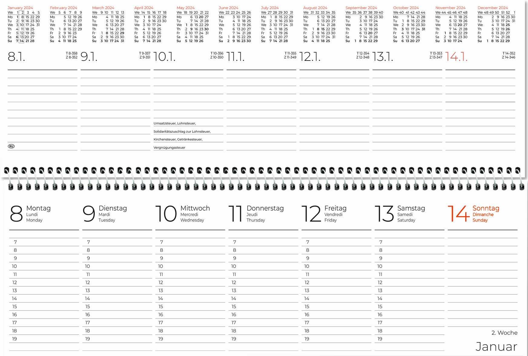 1 Woche auf 2 Seiten, 4-sprachig, 2-Monatsübersicht, Sonn- und Feiertage hervorgehoben. Gesamtumfang: 120 Seiten. Blattgröße: 300 x 100 mm. Inhalt: Vormerkkalender, Jahresübersichten, internationale Feiertage, Ferientermine, Wissenswertes, Notizen, Anschriftenverzeichnis. Stundeneinteilung: 08 - 20 Uhr. Tages-, Wochen- und Zinstagezählung. Druck: grau/rot. Einband: Karton, weiße Wire-O-Bindung.