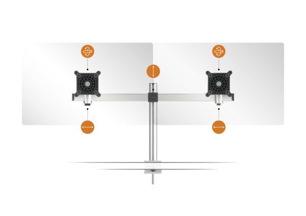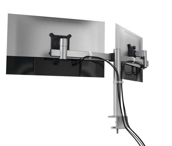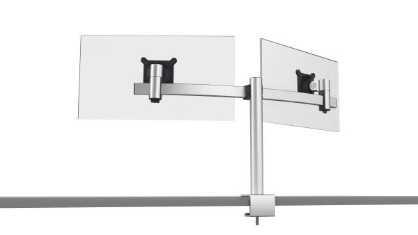 Ob beruflich oder privat, die meisten Menschen verbringen viel Zeit vor dem Computer Bildschirm. Gesundheit und Wohlbefinden spielen daher am Schreibtisch eine wichtige Rolle. Die Monitor Doppelhalterung von DURABLE unterstützt dabei besonders effizientes Arbeiten am ergonomischen Arbeitsplatz.¶¶Einfache Anwendung:¶• Verstellbare Tischhalterung für 2 Monitore¶• Monitorhalterung besteht aus Tischsäule, Querstrebe und 2 verschiebbaren, drehbaren VESA-Befestigungen für Monitore¶• Individuell einstellbare Höhe, Neigung und Positionierung der Bildschirme¶• Extra leichte Anbringung des Bildschirms durch Einrasten in Halterung¶• Sicherheitssystem schützt vor Abrutschen der Geräte bei Höhenverstellung¶• Inkl. 5 individuell anbringbarer Kabelklemmen für geordnete Kabelführung¶¶Qualitätsversprechen:¶• Hochwertige Materialien für eine lange Lebensdauer: aus Aluminium und Premium-Kunststoffen¶• Umweltfreundlich in Anlehnung an die ISO 14021: zu 100 % recycelbar, bis zu 60% aus Recyclingmaterial ¶• Elegantes Design für den Einsatz in verschiedenen Umgebungen¶• Halterungssystem zum Patent angemeldet¶• Made in Germany: Die hochwertigen Monitorhalterungen werden in Deutschland hergestellt. Die Kunststoffteile werden unter höchsten Qualitätsstandards in der DURABLE Fertigung Kamen (Nordrhein-Westfalen) hergestellt. Die Endmontage erfolgt von Hand in der DURABLE Manufaktur ebenfalls in Kamen.¶¶Technische Details:¶• Für Monitore von 21 bis 27 Zoll (53,34 bis 68,58 cm) und 3-8 kg¶• Mit VESA-Befestigung 75 x 75 mm oder 100 x 100 mm (Internationaler Standard der Video Electronics Standards Association für Bildschirme und Monitore) ¶• Monitor 360° drehbar für Arbeiten im Hoch- oder Querformat¶• Monitor 110° neigbar; 85° nach oben, 25° nach unten¶• Monitortragarm höhenverstellbar 50-340 mm¶• Monitore entlang der Querstrebe verschieb- und fixierbar¶• Tischklemme für Tischstärken von 14-44 mm¶• Einfache Montage: Die Schraube der Tischklemme wird mit beiliegendem Werkzeug befestigt¶• Maße: 780 x 445 x 190 mm (B x H x T)