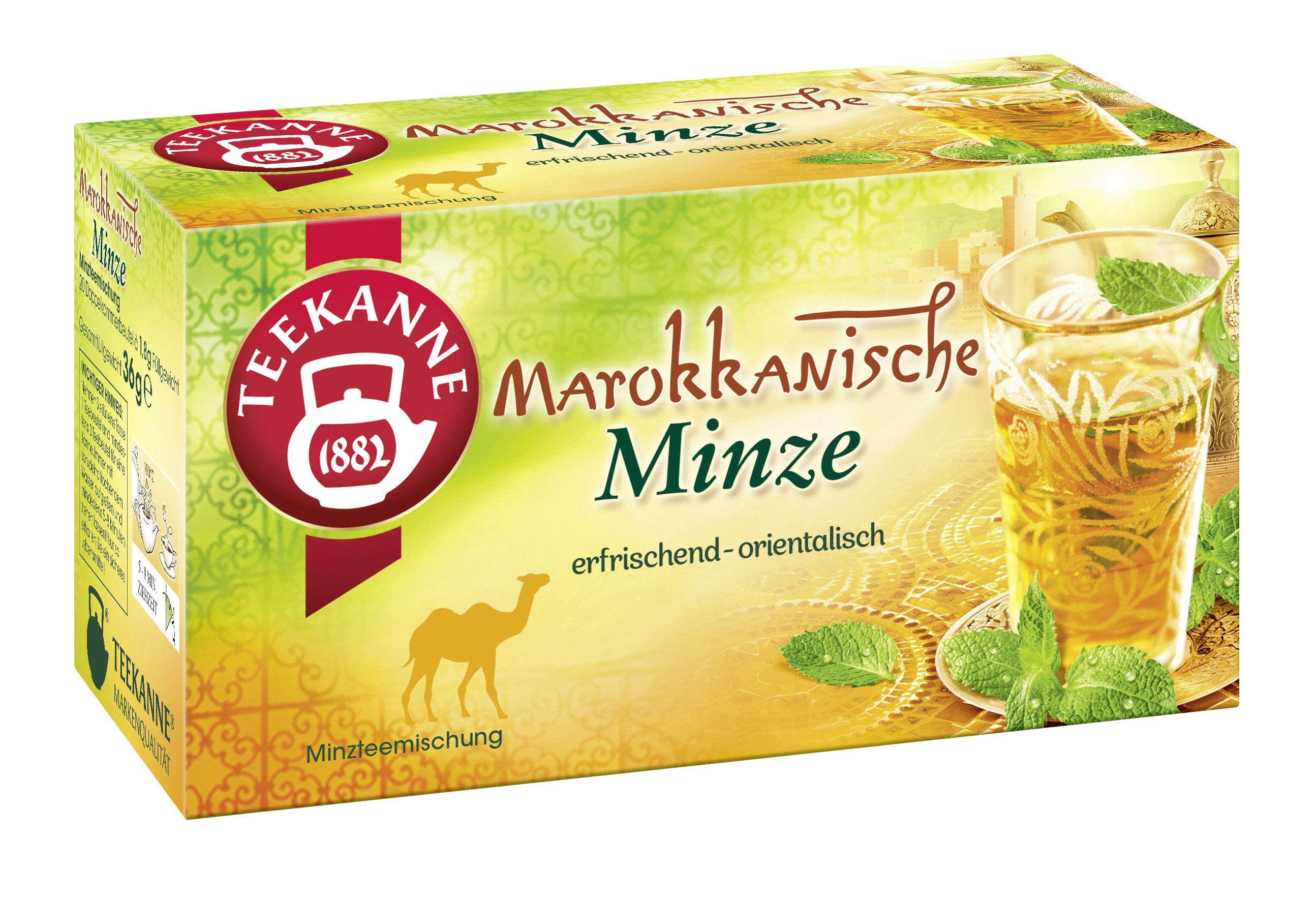 Marokkanische Minze entführt Sie auf eine genussvolle Reise in das Land der zauberhaft orientalischen Düfte, der bunten Basare und der Karawanen, die durch die Sahara ziehen. Ein Land zwischen Meer und Wüste. Genauso gegensätzlich wie das Land, schmeckt auch dieser Tee erfrischend und orientalisch zugleich. TEEKANNE Marokkanische Minze der orientalische Minzgenuss. Sorgfalt und schonende Verarbeitung machen diesen Genuss perfekt. 20 Doppelkammerbeutel à 1,8 g.